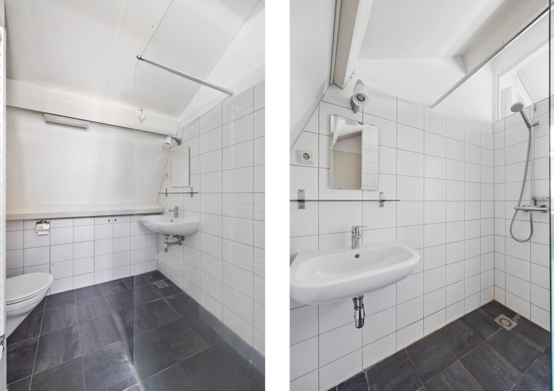 De separate badkamer is voorzien van een inloopdouche, een wastafel en een toilet.