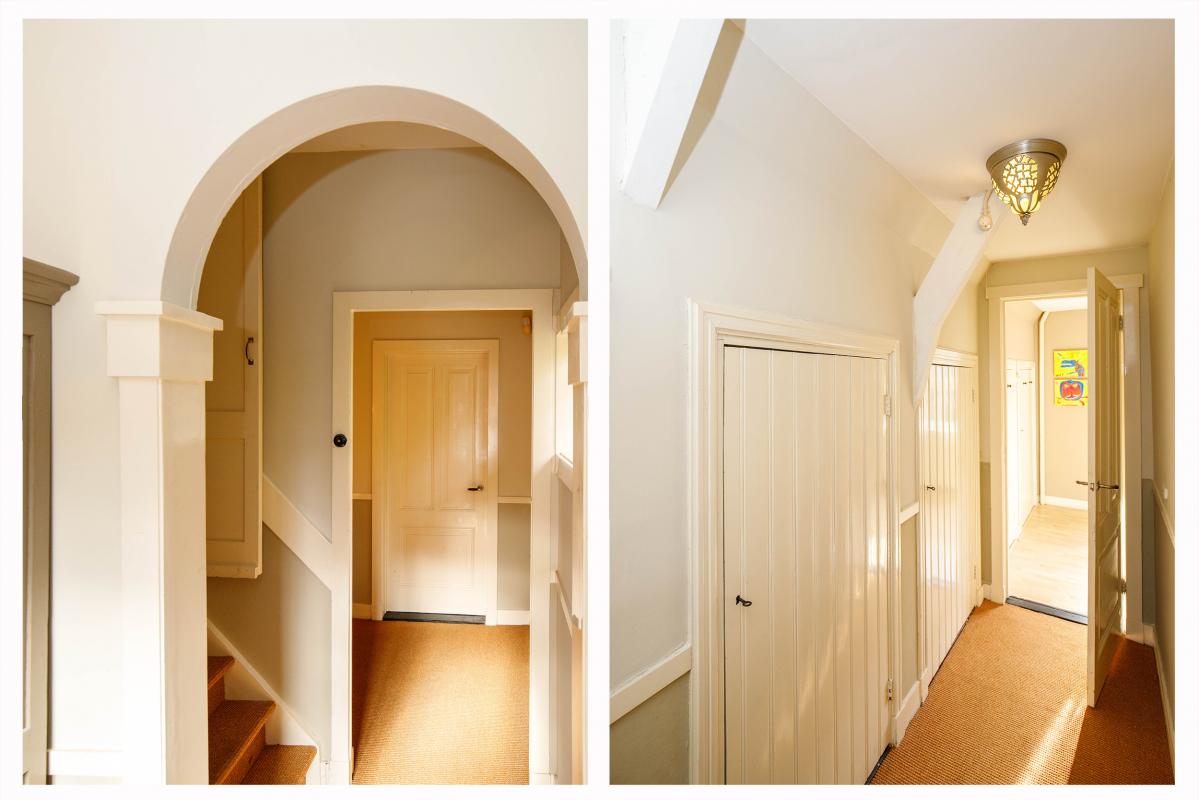 Deze overloop heeft sfeervolle doorkijkjes, glas-in-lood ramen en (ook hier) fijne hoge plafonds.