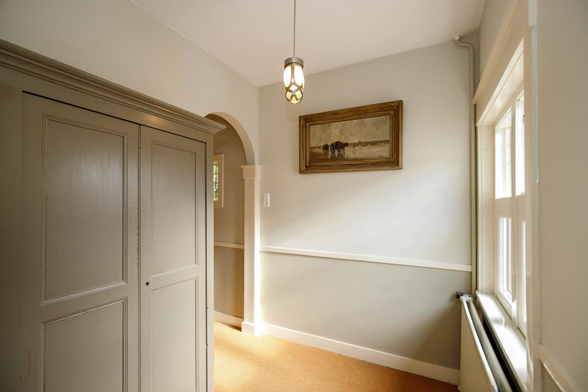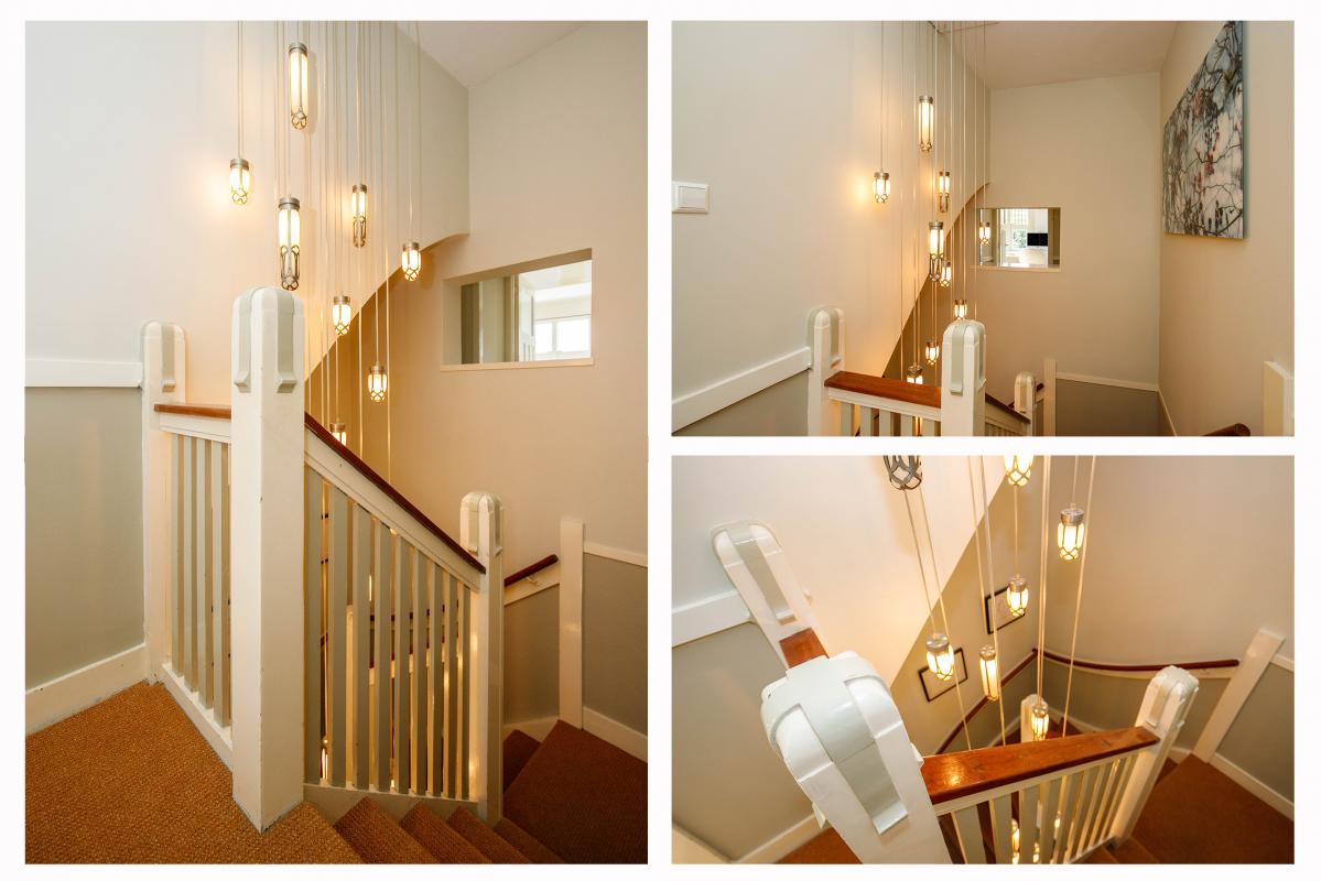 Via het bijzonder fraaie trappenhuis met een Italiaanse glasgeblazen Art-deco lamp van boven tot beneden bereikt u de royale overloop op de eerste verdieping.