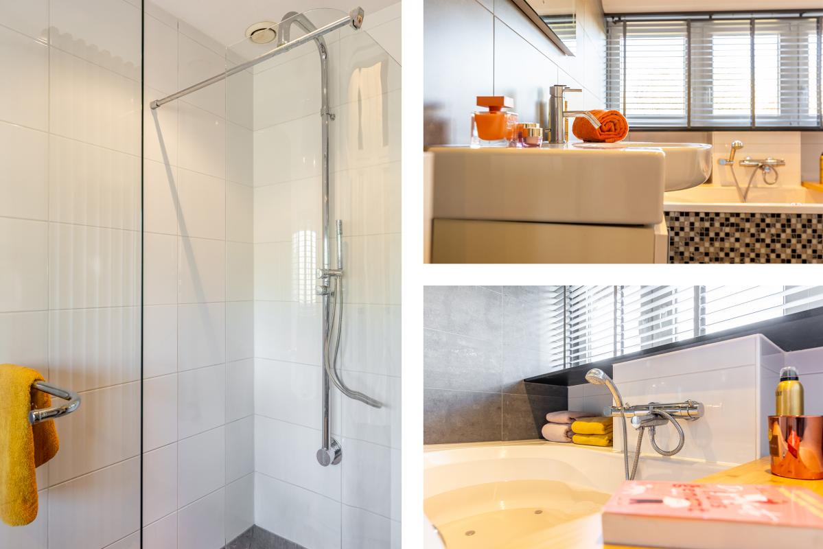 De 2e badkamer (circa 7 m2) heeft een jacuzzi, een inloopdouche, een wastafelmeubel met kasten en vloerverwarming.