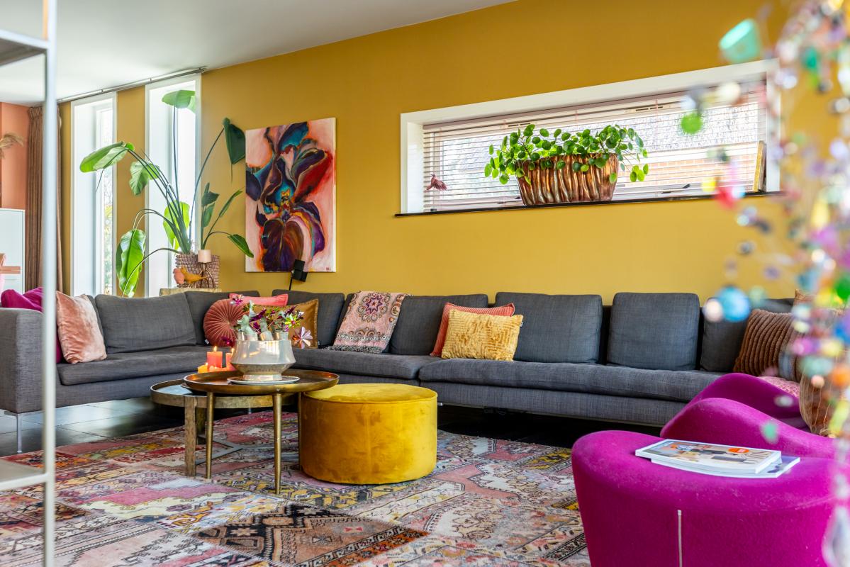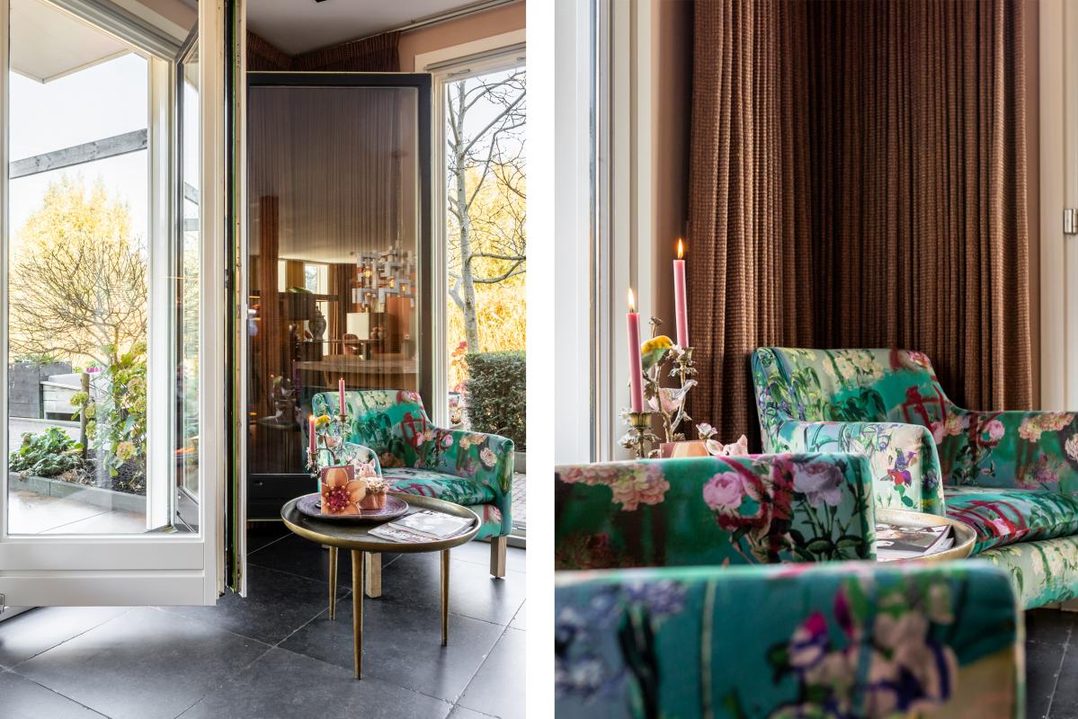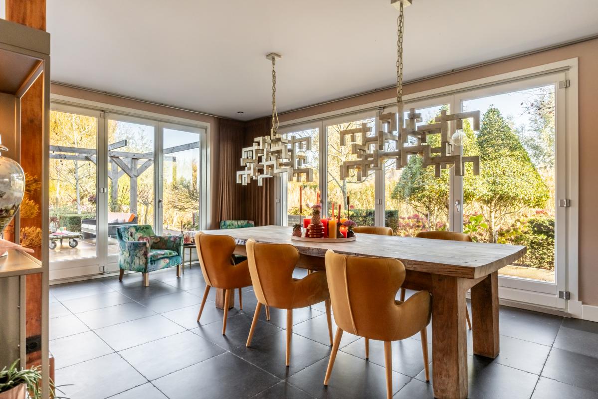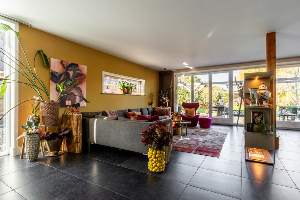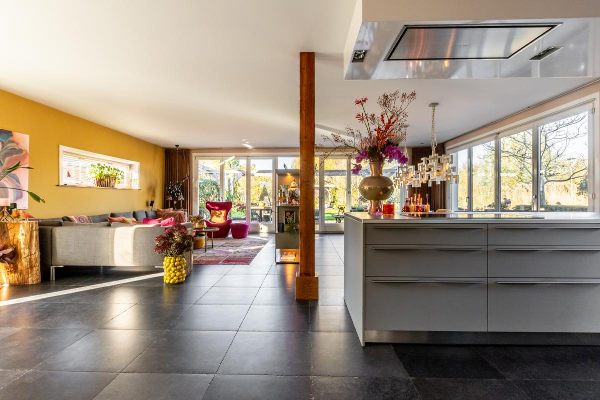 De meer dan riante living (circa 75 m2) heeft een echte wow-factor. Het weidse uitzicht via de grote raampartijen met harmonicadeuren aan 2 zijden is een plaatje: hier vloeien binnen en buiten naadloos in elkaar over.