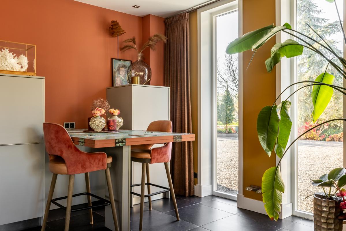 De ruimte is verdeeld door een transparante separatie met aan de ene kant het royale zitgedeelte en aan de anders kant het eetgedeelte. Op de vloer grote plavuizen met vloerverwarming.