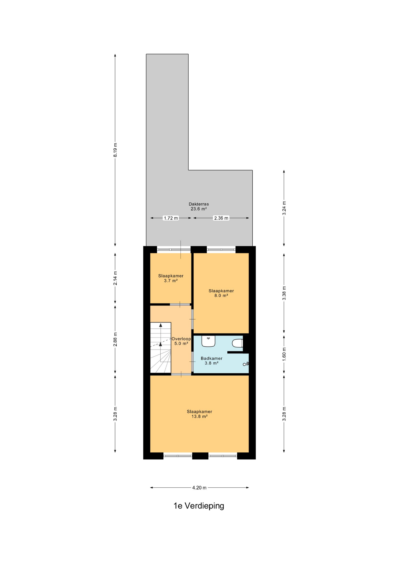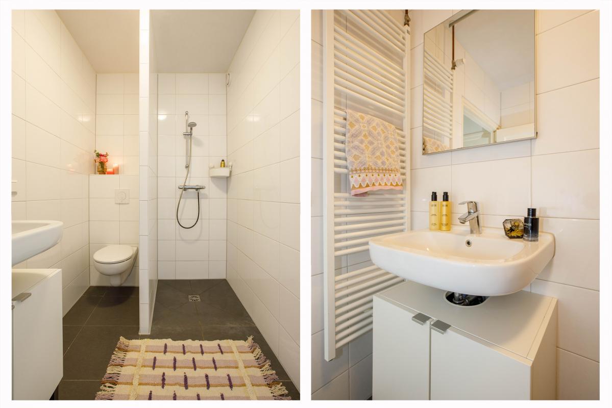 De moderne badkamer is voorzien van een inloopdouche, een hangend toilet, een wastafel met meubel en een design radiator.